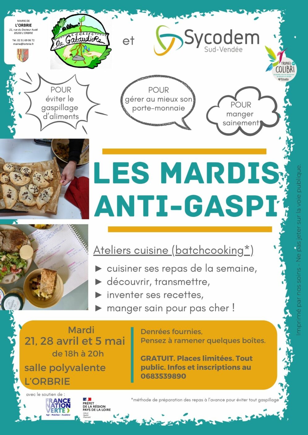 Mardi 21 et 28 avril et mardi 5 mai de 18h à 20h00 à la Salle Polyvalente Louis Massé. Les places sont limitées, infos et inscriptions au 06.83.53.98.90. Ateliers cuisine – Les denrées sont fournies, pensez à ramener quelques boîtes.